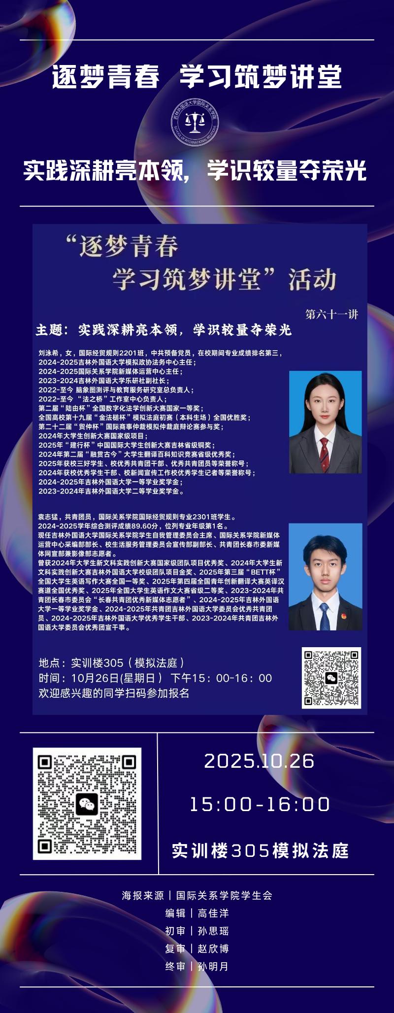 为进一步提升我校学生的实践能力与学识素养,营造“以实践强本领、以学识促成长”的浓厚学习氛围,学校决定举办“逐梦青春 学习筑梦讲堂”第六十一讲。现将具体事宜通告如下: